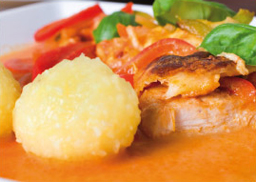 an Mini-Kartoffelklößchen und Paprikagemüse