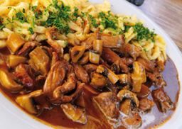 in Champignonsauce mit Spätzle, dazu Broccoli