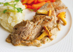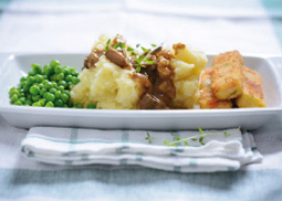 mit Bio-Erbsen und Kartoffelpüree, dazu leicht gebundener Bratensaft
