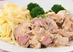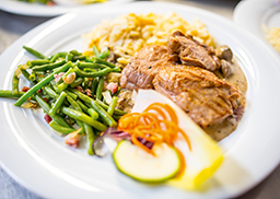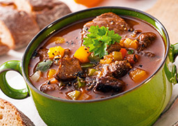 mit buntem Paprika und Kartoffelwürfeln, dazu frisches Baguette
