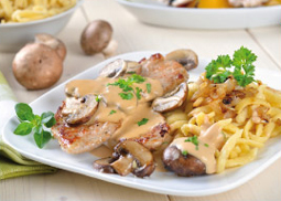 in Champignonsoße mit Spätzle, dazu Romanogemüse