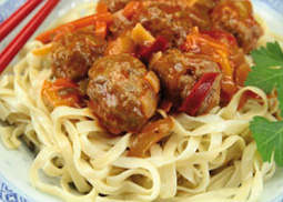 pikante Köttbullar-Chinapfanne auf Bandnudeln