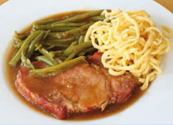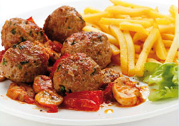 auf Tomaten-Pilzragout dazu Pommes Frites