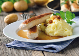 mit Kartoffelpüree und heller Soße, dazu empfehlen wir Karotten Rustica