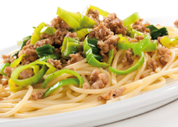 mit gebratenem Rindergehacktem und feinen Porreestreifen