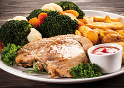 dazu Kaisergemüse und gebackene Kartoffelspalten