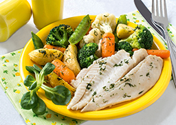 mit buntem Gemüse und Kartoffelspalten