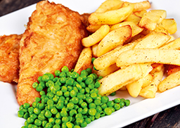 mit Erbsen und Steakhouse-Pommes