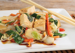 auf asiatischem Gemüse, dazu Vollkornreis