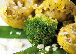 auf Zuckererbsenschoten und Broccoli in Käsesauce