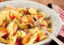 mit Kartoffelspalten und Broccoli-Erbsenmischung