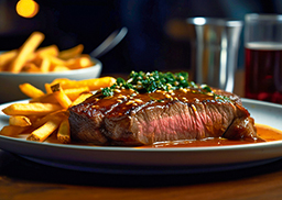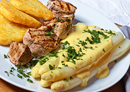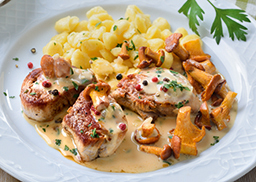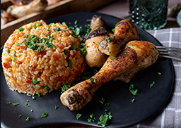 dazu Vollkornreis mit Erbsen und Paprikawürfeln, gebunden mit milder Tomatensauce