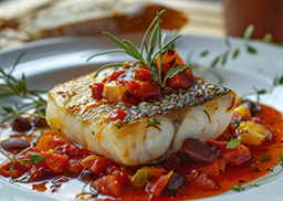 auf der Haut gebraten auf Ratatouille, dazu empfehlen wir braunen Reis