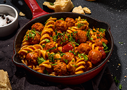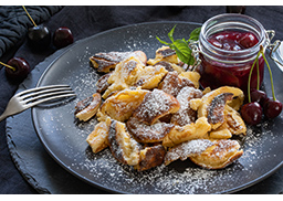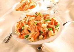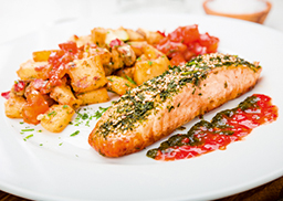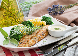 mit Kräutertopping, dazu Bratkartoffeln und Bio-Tomatenragout