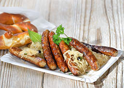 Geflügel-Rostbratwürste auf Sauerkraut mit einer Breze serviert