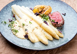 mit Röstkartoffeln, weißem Spargel und Hollandaise