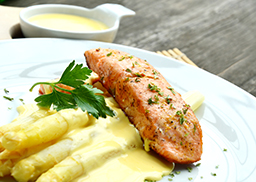 mit MSC-Lachswürfeln und Spargel Tips&Cuts, dazu Hollandaise