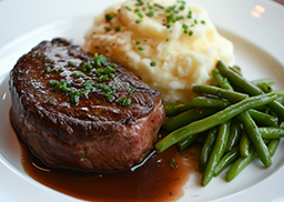 mit Kartoffel-Knoblauch- Püree, an feinen Bohnen