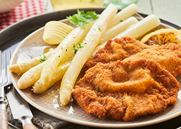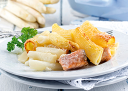 auf Spargel und Hollandaise, dazu eine Beilage Ihrer Wahl (z. B. Röstinchen 32g)